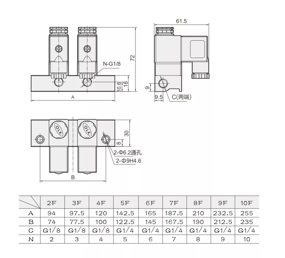 A 2V025 kétállású, kétirányú közvetlen működésű, normál zárt mágnesszelep az alkalmazási követelményeknek megfelelően csatlakoztatható szelepalap kialakításához, 2-12 pozícióból rugalmasan bővíthető. Ez a többállomásos 2V025 mágnesszelep-elosztó kompakt és könnyű kialakítású, de egyéni használatra nem szerelhető szét. A szelepház kiváló minőségű alumíniumötvözetből készül, és NBR tömítőanyagot használ.