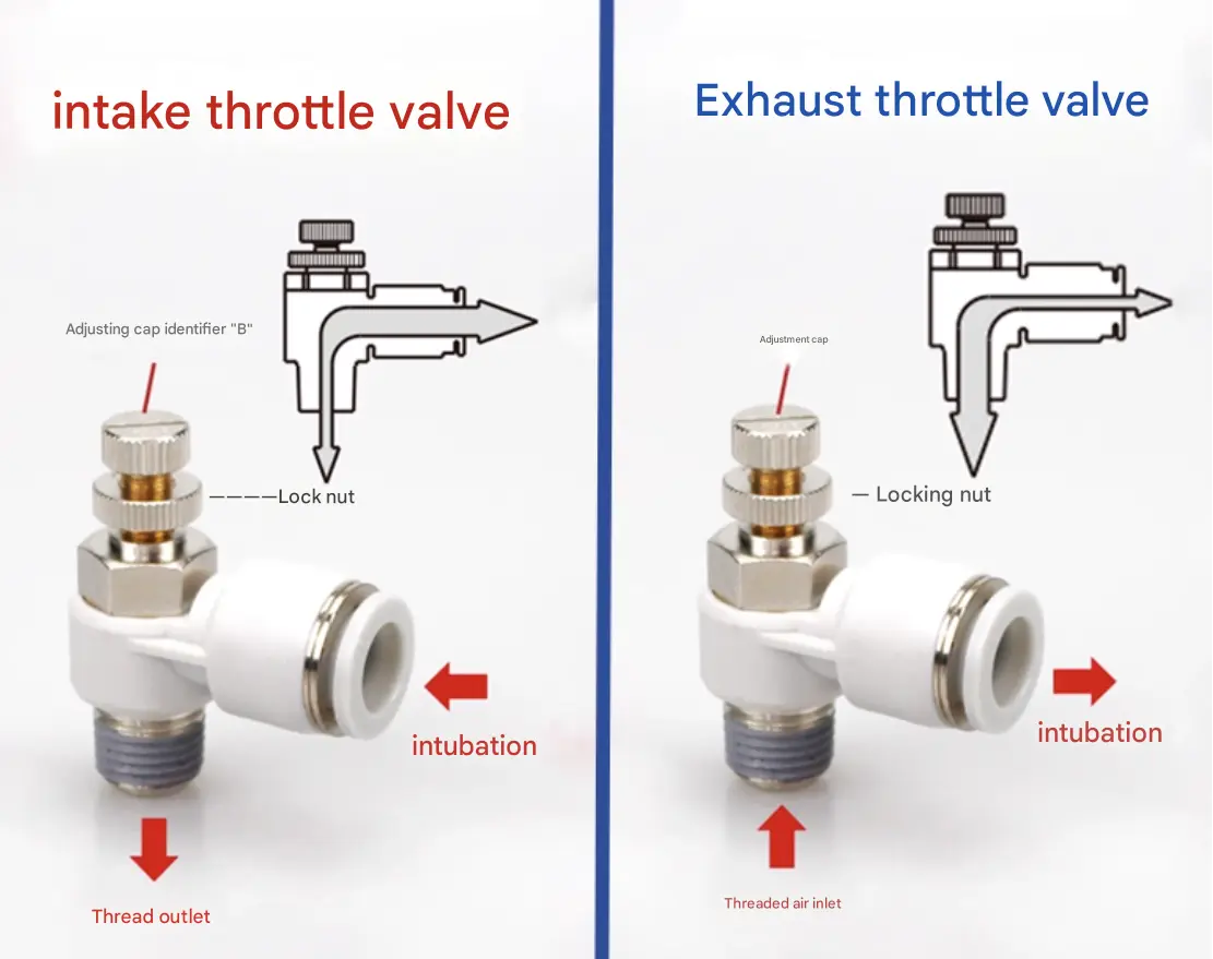 A bemeneti fojtószelepek a csövön keresztül szívják be a levegőt és a menetes nyíláson keresztül távoznak el; a kipufogó fojtószelepek menetes nyíláson keresztül szívják be a levegőt és csövön keresztül a kipufogót.
