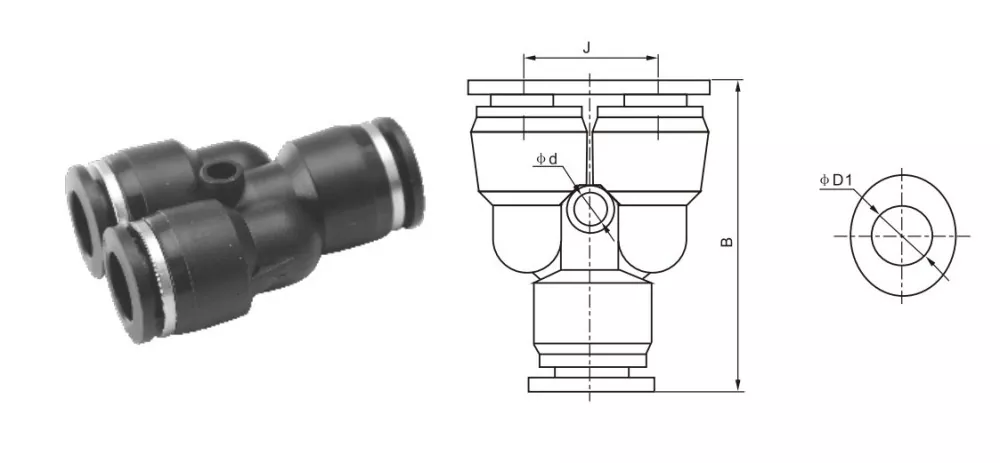 A Py Union Y nyomása a cső illesztése egy Y alakú illesztés, amelyet a légáramlás felosztására vagy kombinálására használnak a pneumatikus rendszerekben.