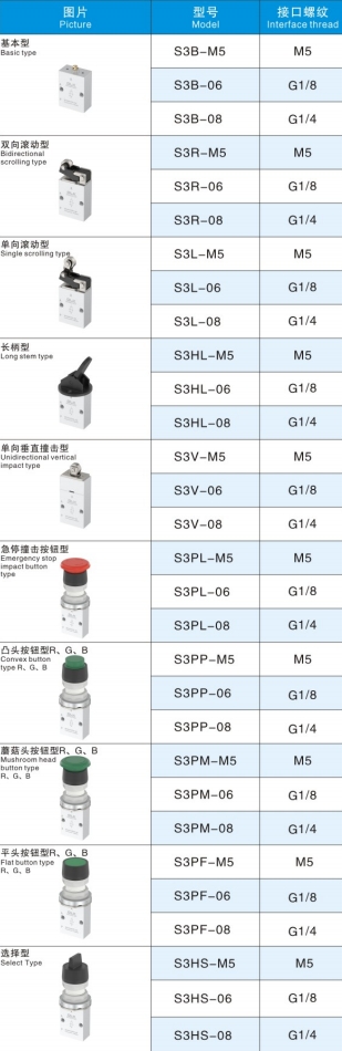 2. S3PF, S3PM, S3PP, S3PL, S3Y, S3HS, S3C, S3D sorozat manuálisan működtetik, különféle kontrollfejek szerkezeti alakjaival, különféle körülmények között.