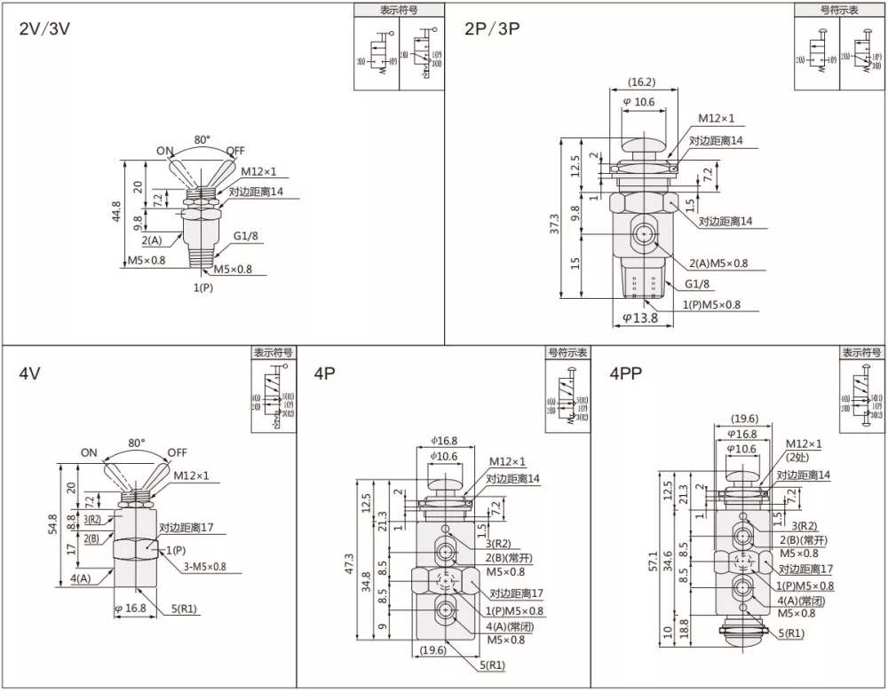 A TAC sorozatú váltószelepnek 2 -es 2 -es, 2 -es 3 -as és 2 -es helyzetét lehet választani. Különböző kar típusú és két típusú szál: M5, G1/8.